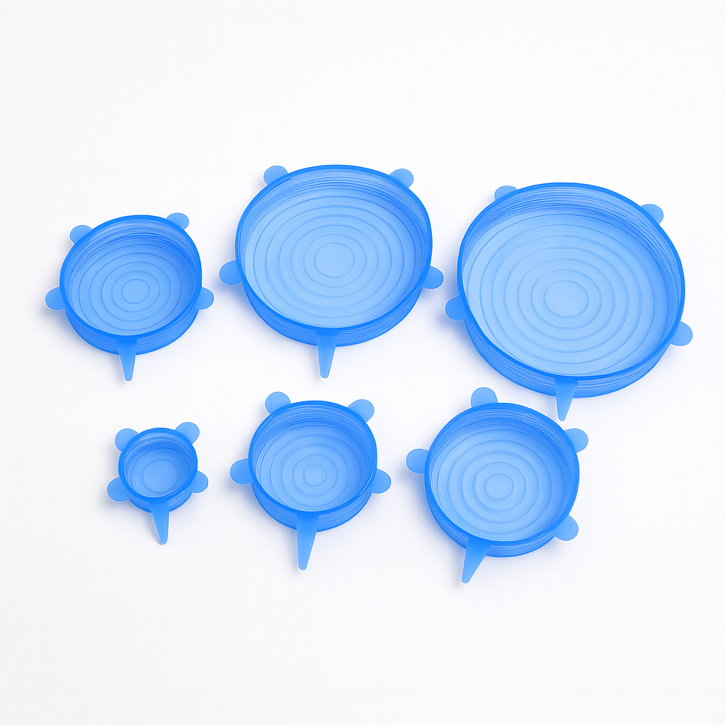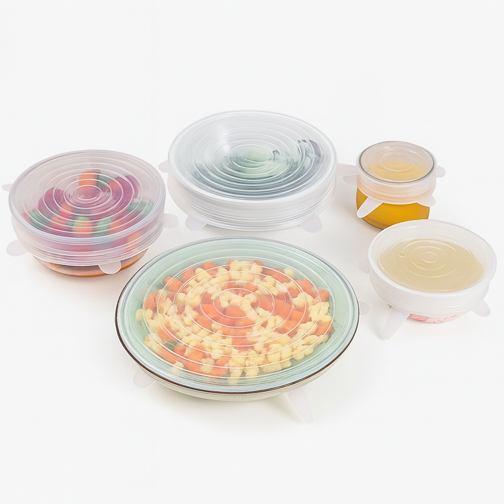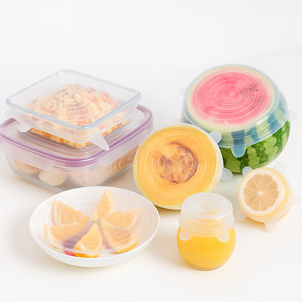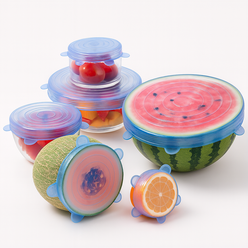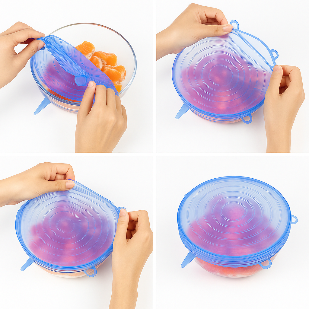 Återanvändbara silikonöverdrag som sträcks över skålar, burkar, glas och halverad frukt för en tät förslutning.